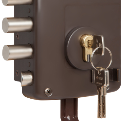 Il sistema meccanico, comprensivo di catenaccio e scrocco a pistoni in acciaio, permette di raggiungere il grado 6 Security della normativa europea EN 12209 (il massimo grado). Grazie alla predisposizione della serratura per borchie di protezione, è possibile aumentare ulteriormente il grado di sicurezza della serratura.